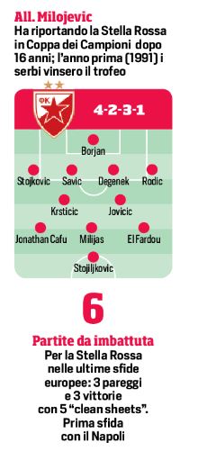 Ha trovato gloria in un minuto e spiccioli lo Stella Rossa, rischiando molto però facendo leva su una lucida follia. La qualificazione alla fase a gironi della prossima Champions, portata via con le unghie dal campo del Salisburgo – doppietta di El Fardou Ben a strettissimo giro – si traduce in un autunno europeo tremendo per la squadra di Belgrado. Gli avversari del Napoli fanno leva sul calore non indifferente che dà sempre il pubblico del Marakana, ovvero lo stadio Rajko Mitic di Belgrado, autentica roccaforte dei serbi: anche perché, le ultime tredici partite internazionali giocate in casa hanno lasciato imbattuto il Fudbalski Klub Crvena Zvezda, Stella Rossa. Da ricordare il nome che conosciamo meglio, quello di Nenad Krsticic: il centrocampista ha giocato cinque anni in Italia, con le maglie di Sampdoria e Bologna. Il brasiliano Jonathan Cafu sulla trequarti è un altro bel pericolo.