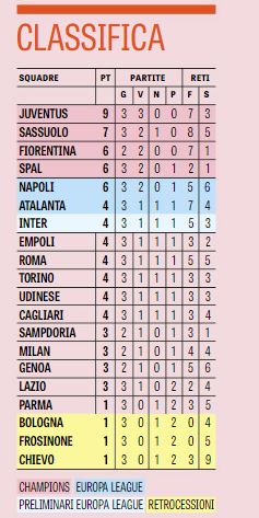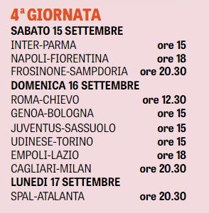 NewsCalcio Serie A – Quarta giornata: date,orari e la classifica By Giuseppe Sacco il Set 5, 2018 - 12:00:54 0 Condividi Ridisegnata la quarta di campionato. Di seguito date orari e classifiche Factory della Comunicazione 0 Condividi FacebookTwitterGoogle+ReddItWhatsAppPinterestE-mail