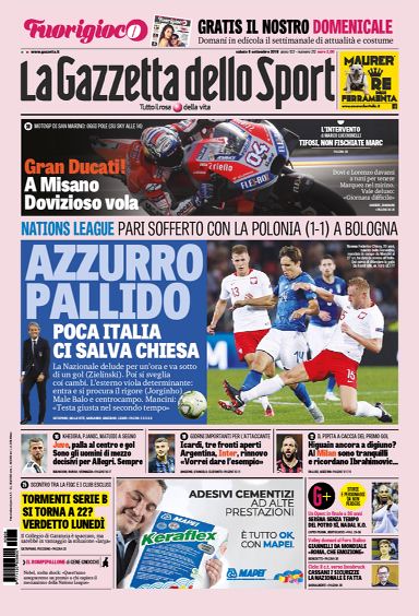 NewsCalcioIn Evidenza Rassegna stampa – L’edicola sportiva nazionale dell’ 8 settembre By Giuseppe Sacco il Set 8, 2018 - 07:40:16 0 Condividi Oggi le prime pagine ci propongono Factory della Comunicazione 0 Condividi FacebookTwitterGoogle+ReddItWhatsAppPinterestE-mail