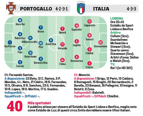 Questa sera allo stadio “Da Luz” di Lisbona, fischio d’inizio alle ore 20,45, saranno presenti 40 mila spettatori, l’Italia di Roberto Mancini, cerca il pronto riscatto e affronterà il Portogallo per la seconda gara di Nations League. I lusitani dovranno fare a meno di Cristiano Ronaldo che non è stato convocato, in avanti l’ex Milan Andrè Silva. Nel ruolo di terzino sinistro ci sarà il calciatore del Napoli Mario Rui. Per quanto riguarda gli azzurri panchina per Balotelli e Insigne, apparsi opachi contro la Polonia, al loro posto Immobile e Chiesa. A centrocampo ancora spazio per Jorginho e Gagliardini con Bonaventura. Infine in difesa esordio per Criscito.