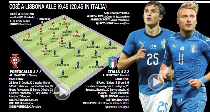Gazzetta – Portogallo/Italia, la Nazionale con tre attaccanti, out Insigne