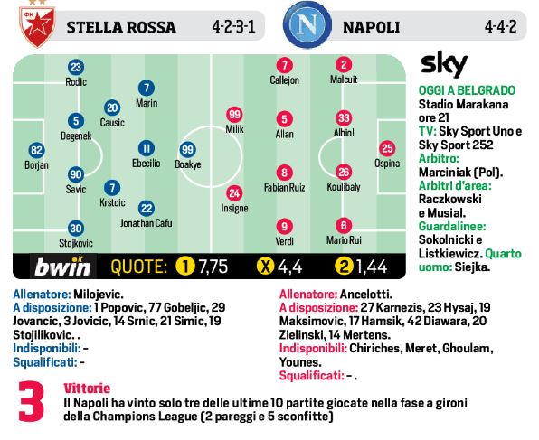 Questa sera alle ore 21,00, allo stadio “Marakana”, il Napoli di Ancelotti affronterà i padroni di casa della Stella Rossa per l’esordio in Champions League, girone C. Il tecnico dei partenopei molto probabilmente, secondo il Corriere dello Sport, farà maxi turnover con sei cambi. In porta gioca Ospina, mentre in difesa potrebbe esserci il debutto di Malcuit per Hysaj mentre torna Albiol al fianco di Koulibaly. A centrocampo Fabian Ruiz, al suo debutto, per Zielinski e Verdi per Callejon. Infine in attacco Milik al posto di Mertens. Per la compagine serba sarà 4-2-3-1 con gli ex “italiani” Krsticic, Marin e Boakye. Sulla trequarti occhio a Jordan Cafù ed Ebecillo.