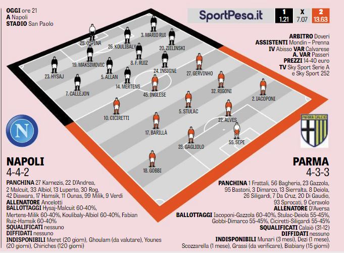 -3 ore a Parma-Napoli, match valido per il turno infrasettimanale del campionato di Serie A. Ecco le probabili formazioni secondo la Gazzetta: