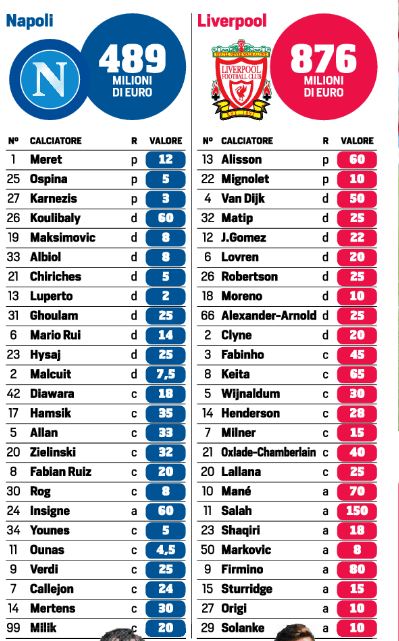 Mapoli/Liverpool è anche questo. Un miliardo e trecentosessantacinque milioni di euro, più o meno: ma evitate le conversioni in sterline, ormai non va neanche più di moda. Sono soldi, eh, molto più di una fortuna, e non si fa in tempo a contarli, forse soltanto ad immaginarli, mettendo uno a fianco all’altro Koulibaly e Alisson, Insigne e Firmino o comunque chi vi pare e piace. Penserete ad una partita di calcio, ma qui siamo ben dentro ad un forziere, questa è una cassaforte che si chiama San Paolo e che non ha bisogno di codici segreti per entrarci: è tutto sotto la luce dei riflettori, sotto ai vostri occhi, in uno scenario da mille e una notte. Questi sono soldi veri, mica bitcoin, e Napoli-Liverpool non è una gita sul Monopoli, compro o vendo: Transfermakt ne ha attribuito un valore complessivo ed è venuta fuori questa galleria di gioielli da accecarvi.