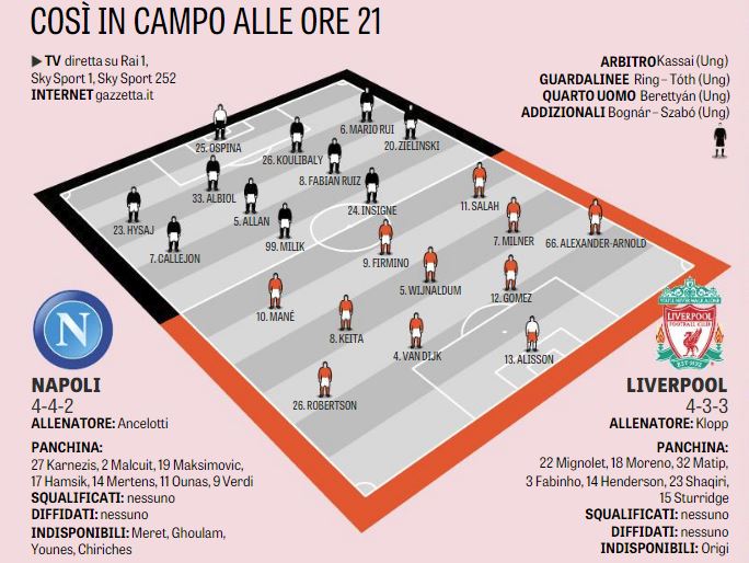 Napoli/Liverpool, la Gazzetta dà le sue formazioni. Due cambi per Ancelotti