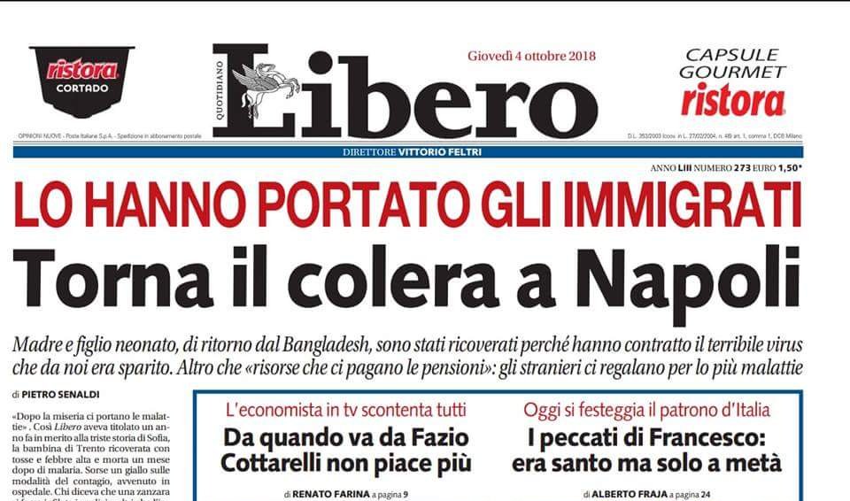 A farne le spese sempre Napoli, stavolta l’argomento è il colera. Al Campus 3 S, alla Rotonda Diaz, tra visite preventive e solidarietà, sotto gli occhi vigili dell’ ideatore dell’ evento, Tommaso Mandato, anche il noto scrittore napoletano, Maurizio de Giovanni, rilascia, ai nostri microfoni, una dichiarazione in merito: “Il titolo di Libero è impietoso, l’episodio viene sottolineato in maniera discriminatoria. Quando la legionella ha colpito la città di Brescia e le autorità bresciane si sono adoperate per risolvere la problematica, nessuno ha messo in dubbio le condizioni igienico-sanitarie della città. Invito il Comune a provvedere per via legale all’ ennesimo attacco di Libero”