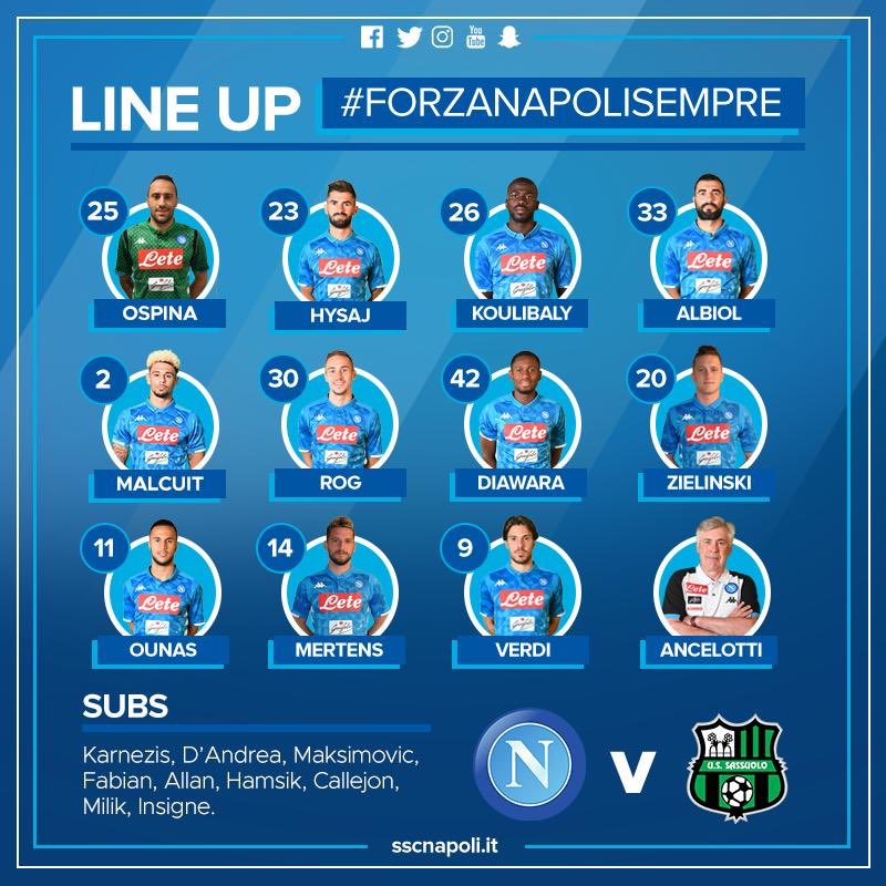 (4-4-2): Ospina; Malcuit, Koulibaly, Albion, Hysaj; Ounas, Rog, Diawara, Zielinski; Mertens, Verdi.
