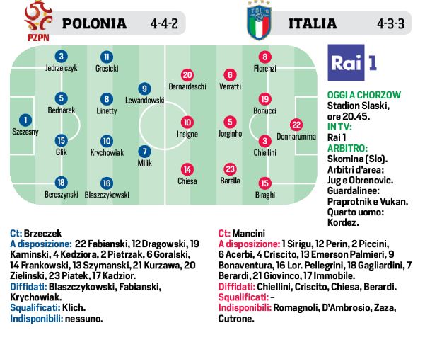 Questa sera l’Italia di Roberto Mancini dovrà vincere in Polonia per evitare la retrocessione nel girone B della Nations League. Il c.t. degli azzurri, secondo il CdS, punterà sul tridente leggero Chiesa, Insigne e Bernardeschi. A centrocampo l’ex Napoli Jorginho assieme a Barella e Verratti. Infine il duo difensivo della Juventus Bonucci-Chiellini a protezione di Donnarumma. Per i padroni di casa la coppia d’attacco Milik-Lewandoski, mentre Zielinski partirà dalla panchina