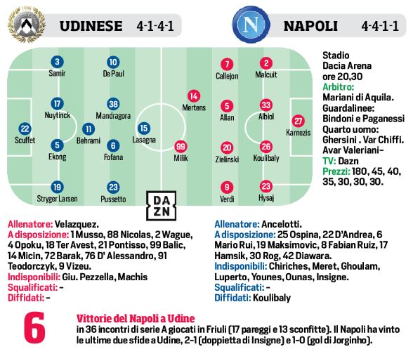 Questa sera alle ore 20,30, alla “Dacia Arena”, il Napoli di Ancelotti proverà a vincere la terza gara in trasferta stagionale, contro i padroni di casa dell’Udinese. Il mister degli azzurri dovrà rinunciare agli infortunati Luperto, Ounas e Insigne, quest’ultimo affaticamento muscolare che però non gli pregiudicherebbe la sfida contro il Psg. Per il resto, secondo il CdS, Malcuit a destra e Hysaj a sinistra, al centro recuperato Koulibaly dall’infortunio. A centrocampo Callejon, Allan, Zielinski, polacco in vantaggio su Hamsik e Verdi. Infine in attacco Mertens alle spalle di Milik. Per i friulani di Velasquez sarà 4-1-4-1, con De Paul dietro la punta Lasagna, mentre Pussetto è in vantaggio su Barak.