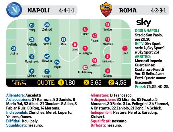 Questa sera allo stadio San Paolo, fischio d’inizio alle ore 20,30, il Napoli di Carlo Ancelotti punterà al successo contro la Roma per riavvicinarsi alla Juventus a 4 punti. Il tecnico degli azzurri, secondo il CdS, farà un po’ di turnover, probabile Malcuit a destra, Maksimovic al posto di Albiol e Hysaj per Mario Rui. A centrocampo possibile turno di riposo per Allan e al suo posto favorito Diawara, mentre Zielinski parte favorito su Fabian Ruiz. Infine in attacco Milik dovrebbe spuntarla su Mertens. I giallorossi invece hanno un solo dubbio Under o Florenzi nel ruolo di esterno d’attacco, il turco in leggero vantaggio, al fianco di Lorenzo Pellegrini e El Sharaawy dietro Edin Dzeko.