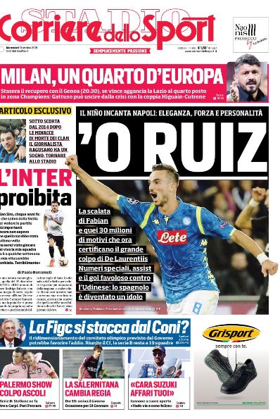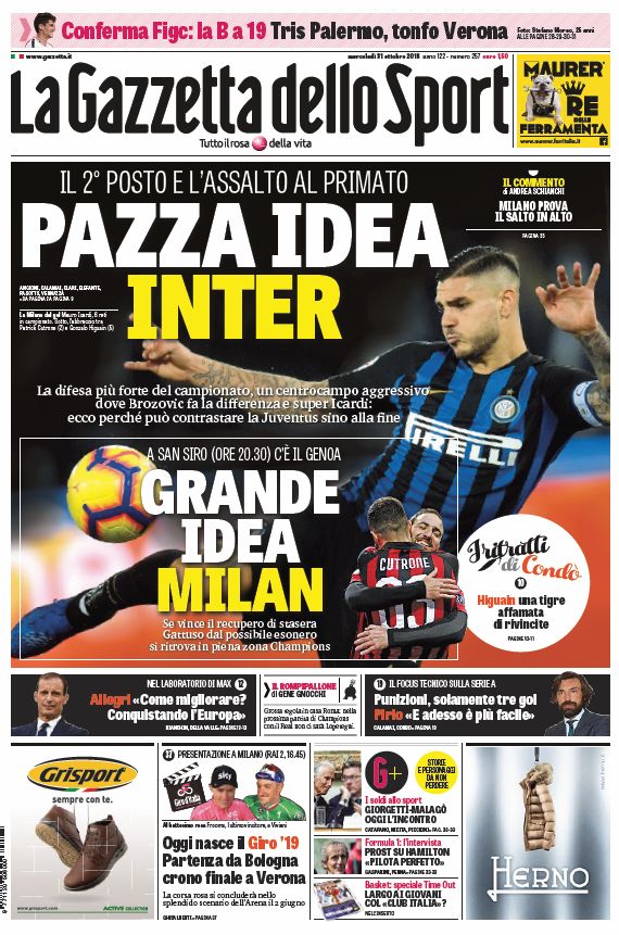 NewsCalcioIn Evidenza Rassegna stampa dl 31 ottobre. Edicola sportiva delle prime pagine By Giuseppe Sacco il Ott 31, 2018 - 07:43:33 0 Condividi Oggi in primo piano sui quitidiani nazionali Factory della Comunicazione EdicolaRassegnaSportivaStampa 0 Condividi FacebookTwitterGoogle+ReddItWhatsAppPinterestE-mail