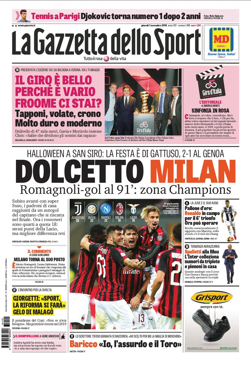 NewsCalcioIn Evidenza Rassegna stampa del 1° novembre. L’edicola delle prime pagine By Giuseppe Sacco il Nov 1, 2018 - 07:35:00 0 Condividi Oggi in primo piano sui quotidiani nazionali Factory della Comunicazione EdicolaPagineprimeRassegna 0 Condividi FacebookTwitterGoogle+ReddItWhatsAppPinterestE-mail