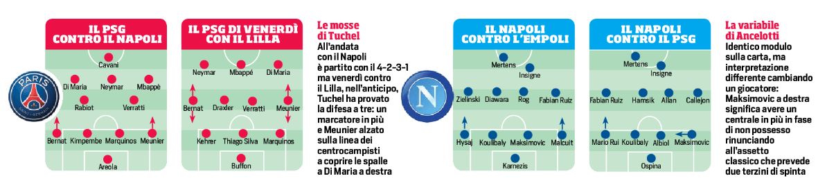 Il Napoli di Ancelotti è varie anime fuse in un collettivo che sa essere sgargiante almeno quanto la sontuosa anarchia del Psg, che ha in sé l’irrinunciabile, scintillante opulenza di Neymar, Mbappé e Cavani (probabilmente), da combinare con le striscianti intuizioni di quel demonio di Angel Fabian Di Maria e con la tendenza a lasciarsi andare di Verratti e Rabiot (oppure Draxel, come con il Lille). Ma il San Paolo ha misure più ampie, più profonde, più larghe d’una scacchiera e si resterà ipnotizzati nello scovare gli angoli di passaggio più segreti per atterrare lievi e felici: scacco matto. Fonte: CdS