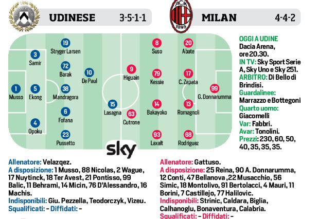 Ore 20,30 Dacia Arena, si sfidano Udinese e Milan. Sfida difficile per i rossoneri. Secondo il CdS scenderanno in campo così