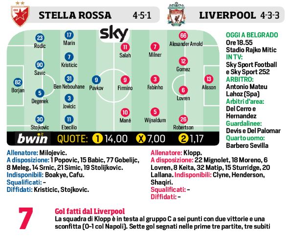Il Cds prova a dare le formazioni di Stella Rossa – Liverpool, così in campo secondo il quotidiano sportivo