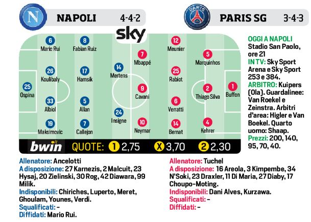 [Grafico Formazioni] CdS – Il Napoli con il (4-4-2) e Psg (3-4-3), panchina per Di Maria