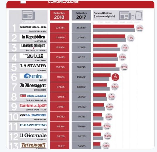 “Anche nel mese di settembre continua l’emorragia di copie dei quotidiani sportivi italiani GazzettadelloSport -7.4%. CorrSport -14.99% Tuttosport -7.95% rispetto a Settembre 2017