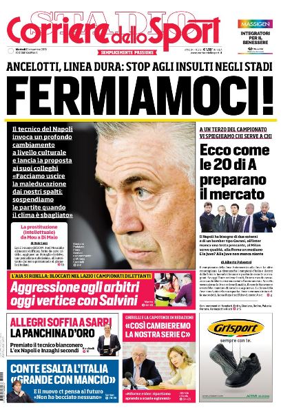Oggi sulla prima pagina del Corriere dello Sport edizione Campania. Il tecnico del Napoli Ancelotti invoca un profondo cambiamento a livello culturale e lancia una proposta: “Facciamo uscire la maleducazione dagli stadi, sopsendiamo le gare”