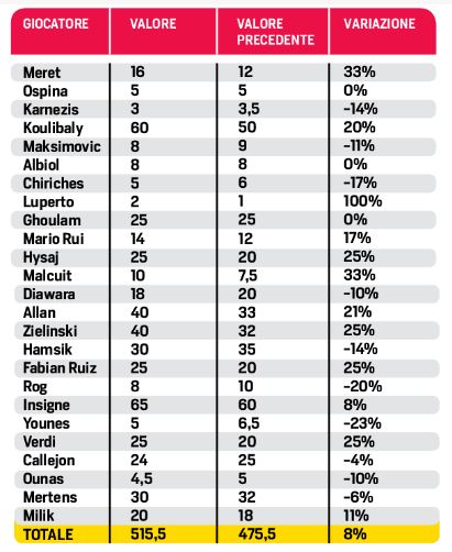 I risultati e il rendimento dei giocatori hanno fatto salire la quotazione della rosa a 515,5 milioni: miniera d’oro con Insigne e Koulibaly pepite preziose.