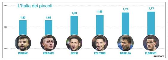 Ci piacciono le finte di Insigne, le piroette di Verratti, la geometria di Sensi. Saranno pure calciatori sotto la media (parliamo di centimetri) ma questi piccoletti in realtà sono sopra la media: più forti, più furbi, più determinati, hanno la cazzimma dentro. E anche più simpatici, fanno tenerezza: avete visto l’Italia schierata durante l’inno nazionale? Da una parte Verratti e dall’altra Insigne non arrivano alle spalle di Bonucci. E pensare che l’altezza media di un calciatore del nostro campionato adesso è di circa un metro e 83 centimetri: in un calcio supervitaminizzato, siamo spettatori del trionfo del talento sul laboratorio, della fantasia sulla programmazione.