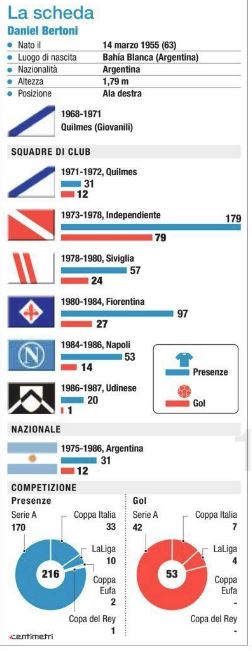 Tango y balon. «Estate 1984, mi misi d’accordo con Juliano qualche giorno prima del sì di Maradona perché Napoli fin dai tempi di Sivori era come una seconda casa per noi argentini. Sarei venuto anche se non avessero preso il più grande di tutti». Addio conte Pontello, addio Firenze. Daniel Bertoni sceglie Napoli. Due anni in cui «il puntero», erede di un altro puntero Ramon Diaz, ha lasciato il segno con la numero 7 sulle spalle. Anche se all’ombra del più grande al mondo. Argentino come lui. Ora fa il commentatore per Fox Sport, va in giro per i sobborghi di Buenos Aires sperando di incontrare un altro Pibe de oro, ogni tanto sente al telefono Menotti e qualche altro campeon del 78. Ma non è epico, non è nostalgico. E ha solo un grande cruccio.