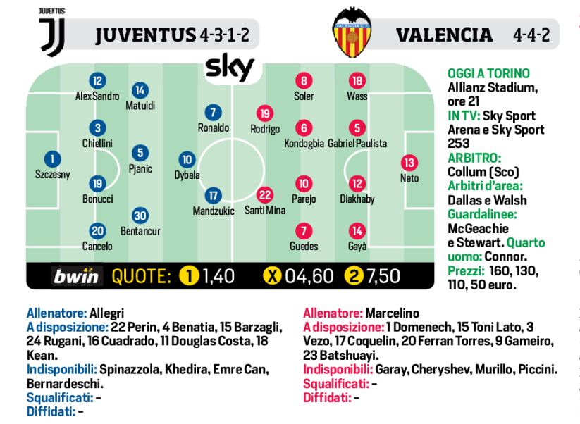 Stasera il tabellone della Champions League prevede Juventus-Valencia. Ecco le probabili scelte dei tecnici secondo Il Corriere dello Sport: