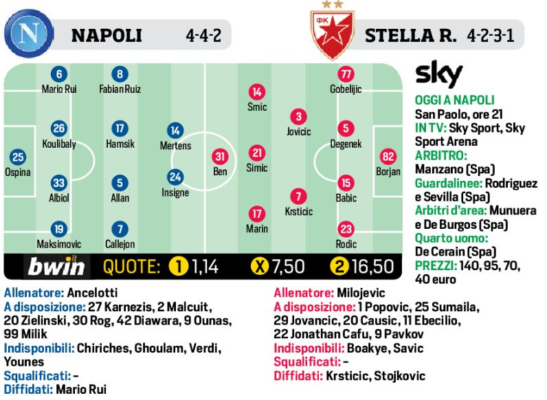 Questa sera alle ore 21,00 il Napoli di Ancelotti cercherà contro la Stella Rossa quel successo che darebbe lo slancio in Champions League e poi attendere notizie da Parigi. Ancelotti manderà in campo i “titolarissimi” della competizione internazionale. Rientrano a centrocampo Hamsik e Fabian Ruiz, con Callejon e Allan a completare la linea mediana. In attacco Insigne e Mertens, il belga in vantaggio su Milik. Infine la difesa con la novità Ospina tra i pali, Albiol, Koulibaly e Mario Rui, mentre c’è il ballottaggio Maksimovic e Hysay con il serbo in leggero vantaggio sull’ex Empoli. Per la squadra di Milejovic c’è un solo dubbio ed è in attacco, Patkov o Ben con il secondo in leggero vantaggio sul castiga-Liverpool.