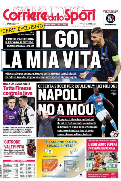 La classica, ormai solita notizia che ogni mese conquista la copertina: lo United vuole Koulibaly. Mica una novità, altroché, ma questa volta l’offerta individuata dai tabloid, rimbalzata fino al Sudamerica e riportata da un canale web del Clarin, sarebbe davvero da sballo. Superiore ai cento milioni di euro: 103, dicevamo, 18 milioni e mezzo più di quanto il Liverpool ha versato nelle casse del Southampton per l’acquisto del centrale della Nazionale olandese, Virgil van Dijk. Per il momento il difensore più pagato della storia. E ciò significa che Kalidou vale già una cifra record. Fonte: CdS