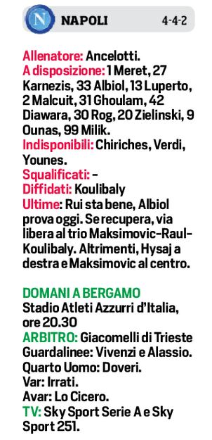 [Grafico fromazioni] CdS – Atalanta/Napoli. Maksimovic al posto di Albiol, 3-4-1-2 per Gasperini