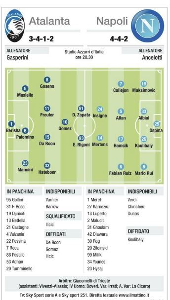 Ancelotti è orientato a riconfermare in blocco la squadra schierata contro la Stella Rossa e ad affidarsi agli uomini Champions: quattro giorni sono stati sufficienti per recuperare da un punto di vista psico-fisico e il tecnico intende affidarsi a quelli più in forma in una partita sulla carta complicata anche in termini d’intensità oltre che dal punto di vista tecnico. Il dubbio maggiore riguarda il difensore centrale da affiancare a Koulibaly: Albiol ha smaltito completamente la distorsione alla caviglia rimediata contro la Stella Rossa e si candida a pieno titolo per una maglia da titolare vista la sua presenza molto importante al centro della difesa. Se, come sembra, il tecnico dovesse schierarlo dal primo minuto il dubbio si sposterebbe per il terzino destro tra Maksimovic e Hysaj e il difensore serbo sarebbe leggermente favorito per una maglia da titolare.