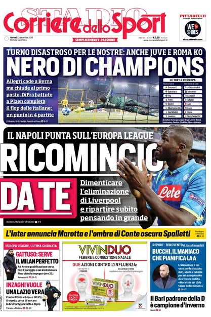 NewsCalcioIn Evidenza Rassegna stampa del 13 dicembre. L’edicola delle prime pagine By Giuseppe Sacco il Dic 13, 2018 - 08:00:46 0 Condividi Oggi in primo piano sui principali quotidiani sportivi nazionali Factory della Comunicazione EdicolaRassegnaStampa 0 Condividi FacebookTwitterGoogle+ReddItWhatsAppPinterestE-mail