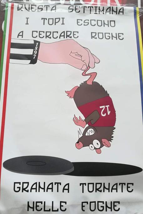 Sui manifesti, affissi l’11 dicembre, era rappresentato un topo in maglia granata che veniva ricacciato in un tombino da un braccio bianconero. Sopra il disegno, c’era la scritta: “Questa settimana i topi escono a cercare rogne. Granata tornate nelle fogne”.