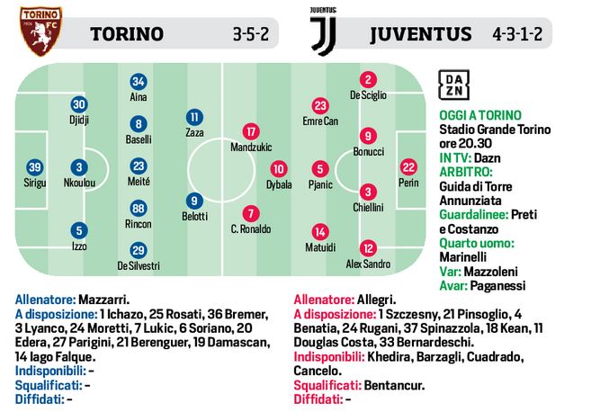 Serie A Ore 20,30: Torino/Juventus, le possibili formazioni in campo