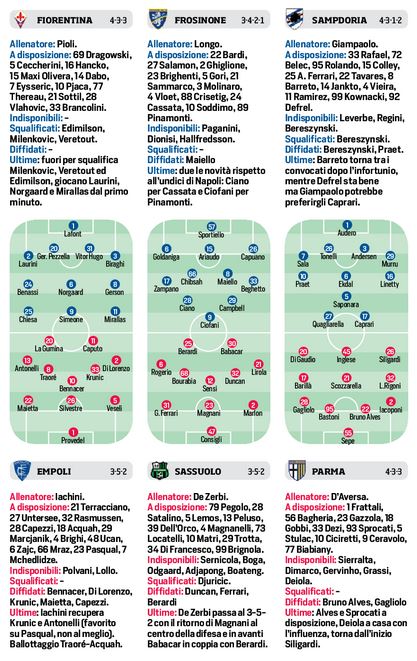 Derby toscano tra Fiorentina ed Empoli. Ambizioni diverse per Frosinone e Sassuolo. Samp e Parma per un posto in Europa. Ecco le probabili formazioni secondo il CdS