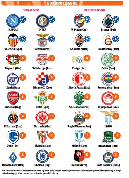 12,56 – Teste di serie: Arsenal, Benfica*, Betis, Chelsea, Dinamo Zagabria, Dynamo Kiev, Frankfurt, Genk, Inter*, Leverkusen, Napoli*, Salisburgo, Siviglia, Valencia*, Villarreal, Zenit Non teste di serie: BATE Borisov, Celtic, Club Brugge*, Fenerbahçe, Galatasaray*, Krasnodar, Lazio, Malmö, Olympiacos, Rapid Wien, Rennes, Slavia Praha, Sporting CP, Shakhtar Donetsk*, Viktoria Plzeň*, Zürich