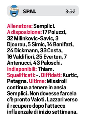 In vista della sfiida di domani alle ore 15,00 allo stadio San Paolo tra il Napoli e la Spal, Carlo Ancelotti starebbe pensando di risparmiare il “diffidato” Koulibaly per schierare Luperto che affianca Albiol. Per il resto in porta Meret, Hysaj a destra e Ghoulam a sinsistra. A centrocampo invece il rientro di Verdi a sinistra, Hamsik, Rog e Callejon a completare la mediana. In attacco Insigne e Milik. Per la Spal invece non recupera Missiroli, al suo posto Valoti, mentre c’è Lazzari. In attacco il duo “pesante” Floccari e Petagna.