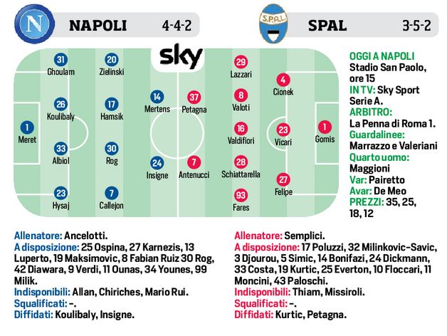Quest’oggi alle ore 15,00, presso lo stadio San Paolo, il Napoli cercherà quel successo contro la Spal che gli permetterebbe di stare per qualche ora vicina alla Juventus e allungare sull’Inter. Mister Ancelotti, nonostate le diffide manderà in campo, secondo il CdS, Koulibaly e Insigne. Il resto della formazione vede Meret tra i pali, Albiol, Hysaj a destra e Ghoulam a sinistra a completare la difesa. A centrocampo Callejon e Zielinski sugli esterni con Rog e Hamsik per la linea mediana. In avanti Insigne e Mertens con Milik in panchina. Per gli ospiti allenati da Semplici, panchina per i diffidati Kurtic e Petagna, al loro posto l’ex Valdifiori e Paloschi, mentre Valoti prende il posto di Missiroli infortunato. In difesa Cionek vince il ballottaggio con Bonifazi.