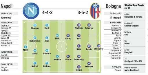Napoli/Bologna, tra qualche ora. Cambi, stavolta, devono essercene per forza, anche perchè a non esserci saranno gli intoccabili, o quasi. Con mister Ancelotti è quasi impossibile “indovinare” la formazione, il quotidiano partenopeo Il Mattino, ci prova: