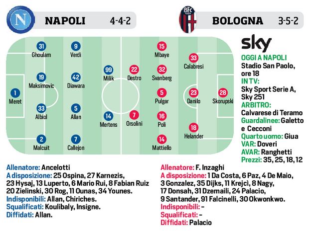 Il Napoli questo pomeriggio alle ore 18,00 affronterà il Bologna per l’ultima giornata del girone d’andata di campionato e Carlo Ancelotti dovrà fare a meno dell’infortunato Hamsik e degli squalificati Koulibaly e Insigne. Secondo il CdS al posto dello slovacco dovrebbe esserci Diawara, per il difensore senegalese Maksimovic e infine Mertens per il ragazzo di Frattamaggiore. Il resto della formazione vede Malcuit a destra, Ghoulam a sinistra, mentre l’ex della gara Verdi sarà la carta che manderà il campo il mister. I felsinei di Pippo Inzaghi scenderanno in campo con il 3-5-2, Orsolini al fianco di Destro, con Palacio e Santander in pachina. Dzemiaili va in panchina, spazio quindi a Pulgar