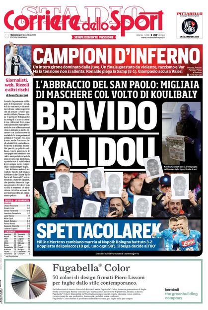 Un bimbo stringe forte il cartoncino col volto di Koulibaly. Lo avrà conservato tornando a casa, qualcuno presto gli spiegherà per quale motivo il San Paolo ne era colmo. Ognuno esponeva il suo, lo faceva fiero, lo alzava al cielo affinché tutti potessero vederlo. C’è anche uno striscione, all’esterno dello stadio e poi presente nei distinti, che recita: «Siamo tutti Koulibaly, no al razzismo». I tifosi che l’hanno ideato si fanno spazio mentre passa il pullman del Napoli a poche ore dall’inizio della partita. Vorrebbero che qualcuno lo notasse, che tutti sappiano quant’è forte l’amore che la città nutre nei confronti del proprio difensore centrale, il protagonista inatteso di una settimana di parole e pareri, di solidarietà e vergogna.  Fonte: CdS