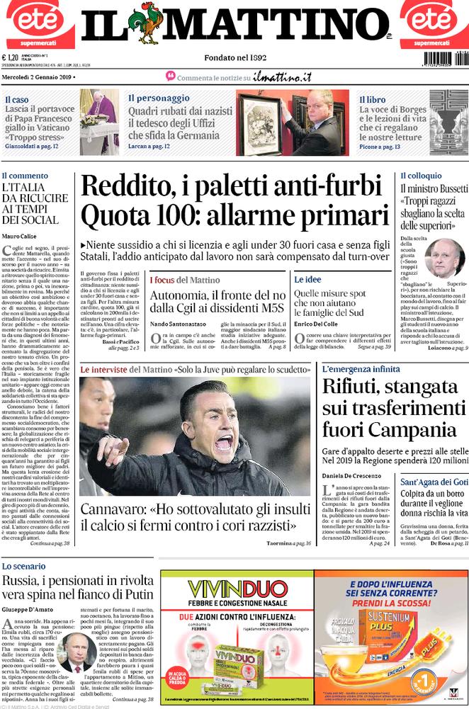 NewsCalcioIn Evidenza Rassegna stampa del 2 gennaio. L’edicola sportiva nazionale By Giuseppe Sacco il Gen 2, 2019 - 07:40:45 0 Condividi Oggi in primo piano sui quotidiani sportivi nazionali Factory della Comunicazione RassegnaStampa 0 Condividi FacebookTwitterGoogle+ReddItWhatsAppPinterestE-mail