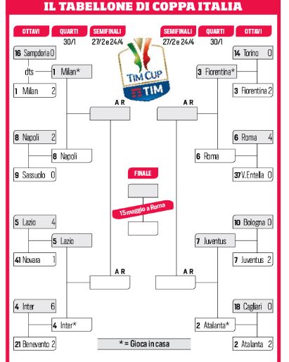NewsCalcio Coppa Italia: tabellone fino alla finale e regolamento. Nessun sorteggio per il Milan By Giuseppe Sacco il Gen 15, 2019 - 13:00:07 0 Condividi Ecco i due grafici di Coppa Italia tratti dal Corriere dello Sport su tabellone e regolamento Factory della Comunicazione CoppaItaliaregolamento 0 Condividi FacebookTwitterGoogle+ReddItWhatsAppPinterestE-mail
