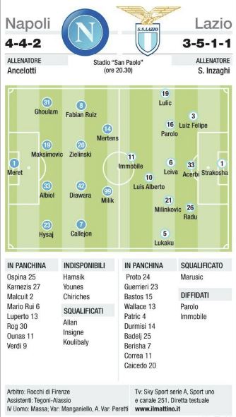 Fuori Allan e Hamsik, il mediano brasiliano prezioso in fase d’interdizione e negli strappi palla al piede per ribaltare la manovra, lo slovacco è quello che dà ordine alla manovra nella posizione di playmaker. In campo Diawara e Fabian Ruiz, la stessa coppia di centrocampo già impiegata domenica scorsa contro il Sassuolo in coppa Italia. In panchina Rog che potrebbe tornare utile a gara in corso, da considerare quasi certamente l’ultima stagionale in maglia azzurra: il mediano croato è vicino al Siviglia e in questi giorni si chiuderà l’operazione, unica programmata dal club azzurro per questo mercato di gennaio con gli altri discorsi (innanzitutto quello legato al messicano Lozano del Psv) che slitteranno a giugno. Il poker di centrocampo verrà completato da Callejon a destra, lo spagnolo ancora alla ricerca del primo gol stagionale tra campionato e coppe (un digiuno di ben 23 partite per l’ex attaccante del Real Madrid solitamente abituato ad arrivare in doppia cifra), e Zielinski a sinistra, il polacco da considerare sempre più un jolly nel Napoli di Ancelotti. L’alternativa è Verdi, in buona condizione e pronto a subentrare sia da esterno sinistro che più avanti nella posizione di mezzapunta.
