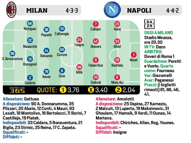 [Grafico Formazioni] Milan-Napoli CdS – Insigne al fianco di Milik. Esordio a San Siro per Paqueta