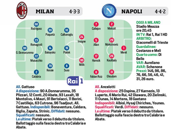 Questa sera allo stadio San Siro, con fischio d’inizio alle ore 20,45, si disputerà il quarto di finale di Coppa Italia tra i padroni di casa del Milan e il Napoli. In caso di parità nei tempi regolamentari, supplementari ed eventualmente ai calci di rigore. Il tecnico dei rossoneri Gattuso, rispetto a sabato scorso, faarà un solo cambio, Piatek al posto di Cutrone. Per il resto un solo ballottaggio Calabria-Conti sulla fascia destra conn il primo in leggero vantaggio sull’ex Atalanta. Ancelotti invece farà diversi cambi di formazione. Meret tra i pali, Maksimovic al posto di Albiol, a sinistra Ghoulam. A centrocampo giocherà la coppia Allan-Hamsik e infine in attacco Insigne e Milik con Mertens in panchina.