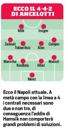 Il sogno dell’Europa League, in mezzo al campo – da titolari in pectore – ci andranno Allan e Fabian Ruiz e Zielinski, potrà starsene comodamente a sinistra, spruzzano la sua intelligenza qua e là, entrando tra le linee, divagando con quella genialità che contro la Sampdoria ha di nuovo incantato.Fonte: CdS