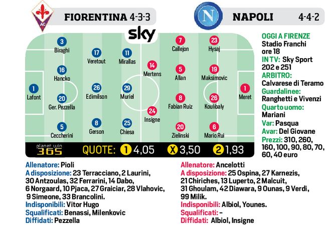 Questo pomeriggio allo stadio “Franchi”, con fischio d’inizio alle ore 18,00, la Fiorentina sfiderà il Napoli per la quarta giornata di ritorno. Per il tecnico dei viola Stefano Pioli non sarà semplice fare la formazione, soprattutto in difesa cone le assenze di Milenkovic per squalifica e di Victor Hugo per inforunio. In forte dubbio anche Laurini, al loro posto Ceccherini e Hancko. In attacco ballottaggio Miralles-Simeone con il belga, secondo il CdS, in leggero vantaggio. Ancelotti invece punterà su Fabian Ruiz in cabina di regia, Sulle fasce di difesa Hysaj e Mario Rui, mentre Mertens sembra avere la meglio su Milik per affiancare Insigne.