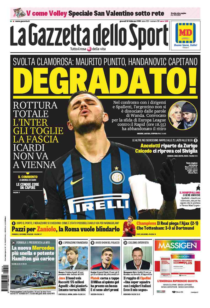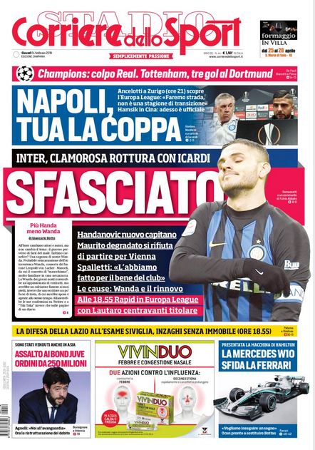 NewsCalcioIn Evidenza Rassegna stampa del 14 febbraio. Edicola sportiva nazionale By Giuseppe Sacco il Feb 14, 2019 - 07:40:58 0 Condividi Oggi queste le prime pagine sportive nazionali Factory della Comunicazione RassegnaStampa 0 Condividi FacebookTwitterGoogle+ReddItWhatsAppPinterestE-mail
