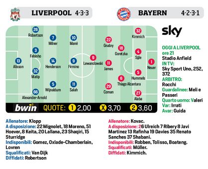 C’è Liverpool-Bayern Monaco all’orizzonte e Kovac, tecnico dei tedeschi, avrebbe studiato le partite giocate dal Napoli di Ancelotti contro gli inglesi per battere la compagine allenata da Klopp. Ecco le probabili formazioni secondo Il Corriere dello Sport: