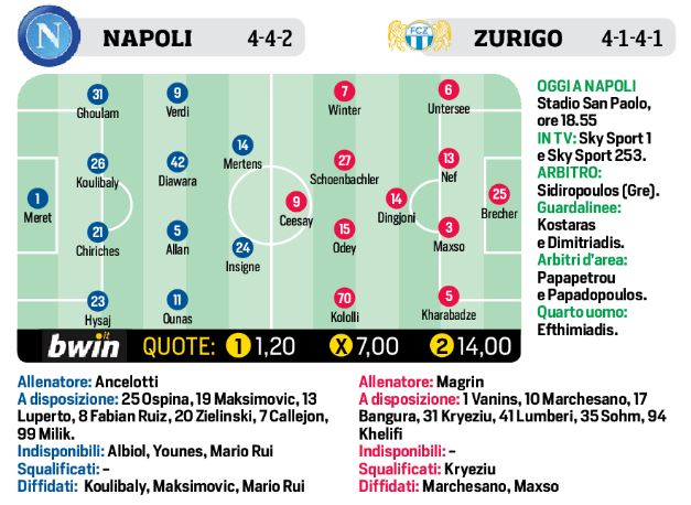 Il Napoli questo pomeriggio alle ore 18,55, presso lo stadio San Paolo, affronterà lo Zurigo per il return-match di Europa League. Dopo l’1-3 dell’andata, secondo il CdS, il tecnico Carlo Ancelotti farà ampio turnover con il ritorno dopo diversi mesi per infortunio di Chiriches che affiancherà Koulibaly, mentre Hysaj giocherà a destra con Ghoulam a sinistra. A centrocampo Allan e Diawara al centro, mentre sulle corsie esterne Ounas e Verdi. In attacco invece Insigne e Mertens. L’allenatore degli svizzeri invece punterà sul 4-1-4-1 con Odey alle spalle di Ceesay e Dingioni davanti alla difesa.